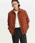 Une surchemise en flanelle 100% coton biologique à carreaux rouges et oranges.